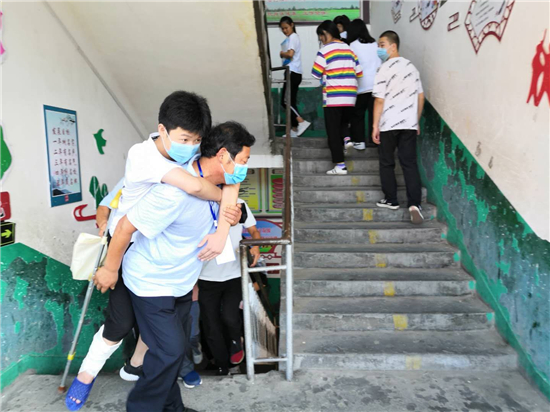 “終于到了,要不是身體好,還真不能一口氣把這孩子背上三樓?!编惓强h第三實驗中學考務老師張子江邊擦汗邊笑著說。