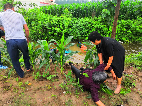 7月26日,連續(xù)多日的降雨已導(dǎo)致農(nóng)村坑滿河平、積水頗深。當(dāng)日下午4時(shí),依然時(shí)雷聲陣陣、雨如豆粒,二人在宜路鎮(zhèn)張寨村小學(xué)附近的玉米田間拍照核查“圖斑”時(shí),看到一輛車箱內(nèi)載有幾位老人的電動(dòng)三輪車冒雨從路邊疾駛過(guò)去。緊接著聽(tīng)到“撲通”一聲,趙文波、李偉二人立即意識(shí)到是三輪車掉進(jìn)路溝、落水了。