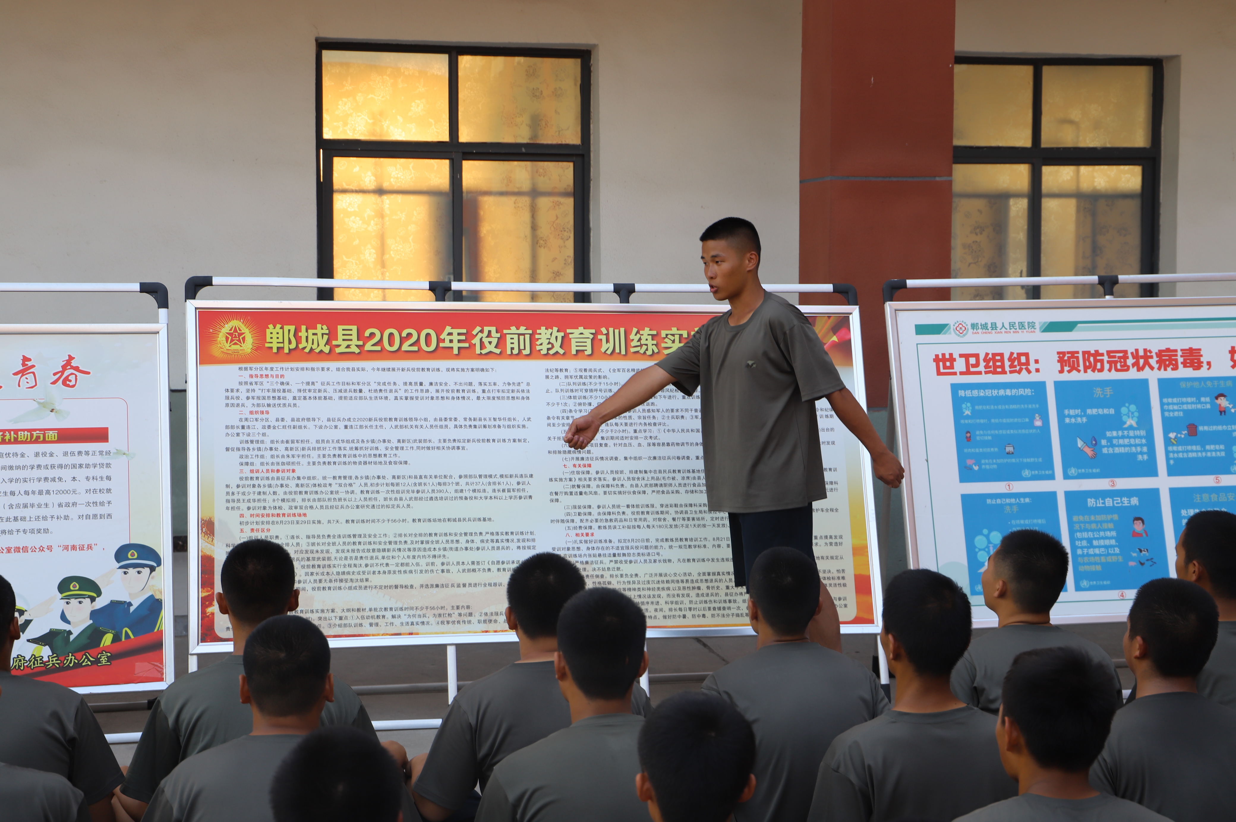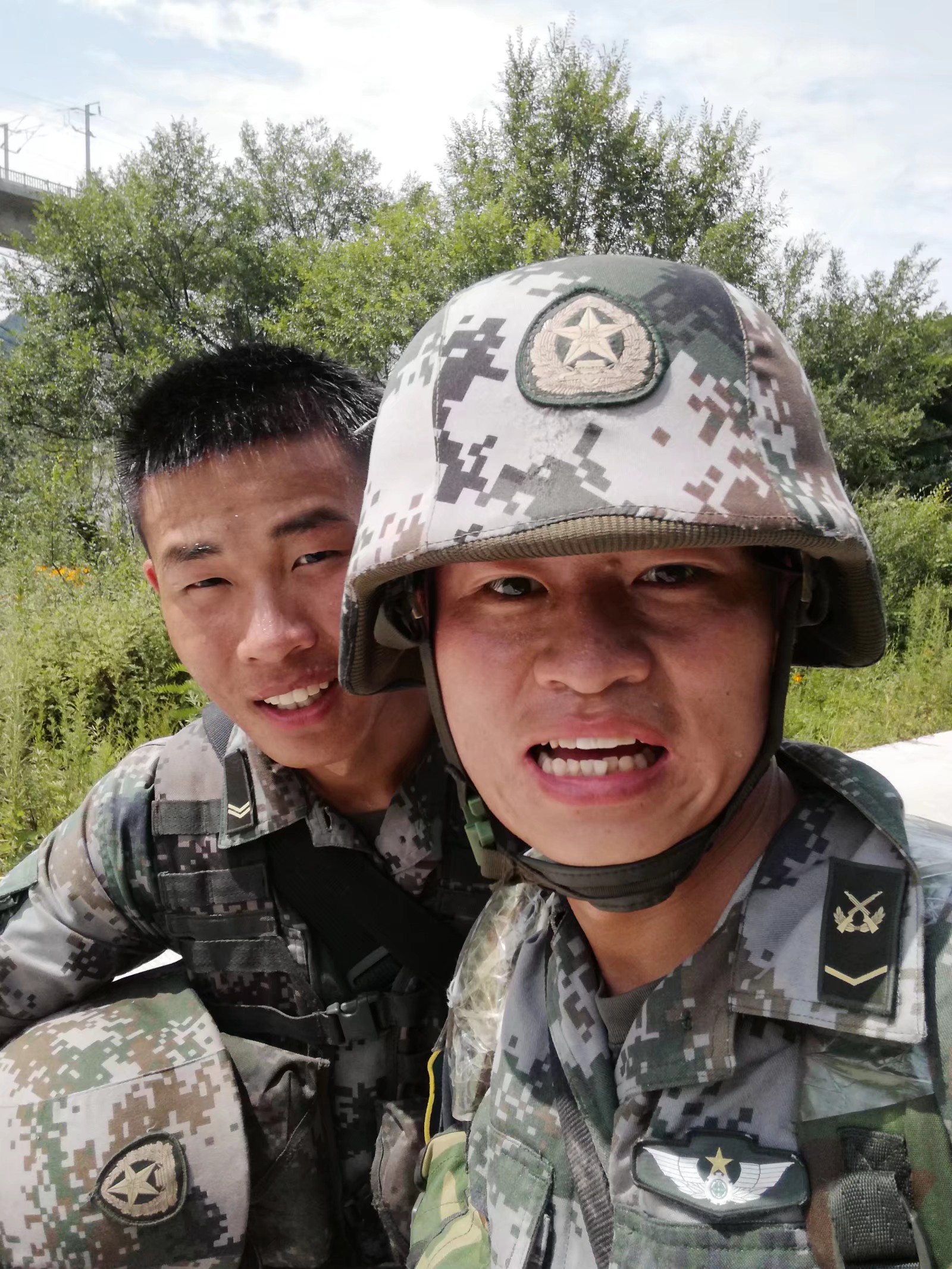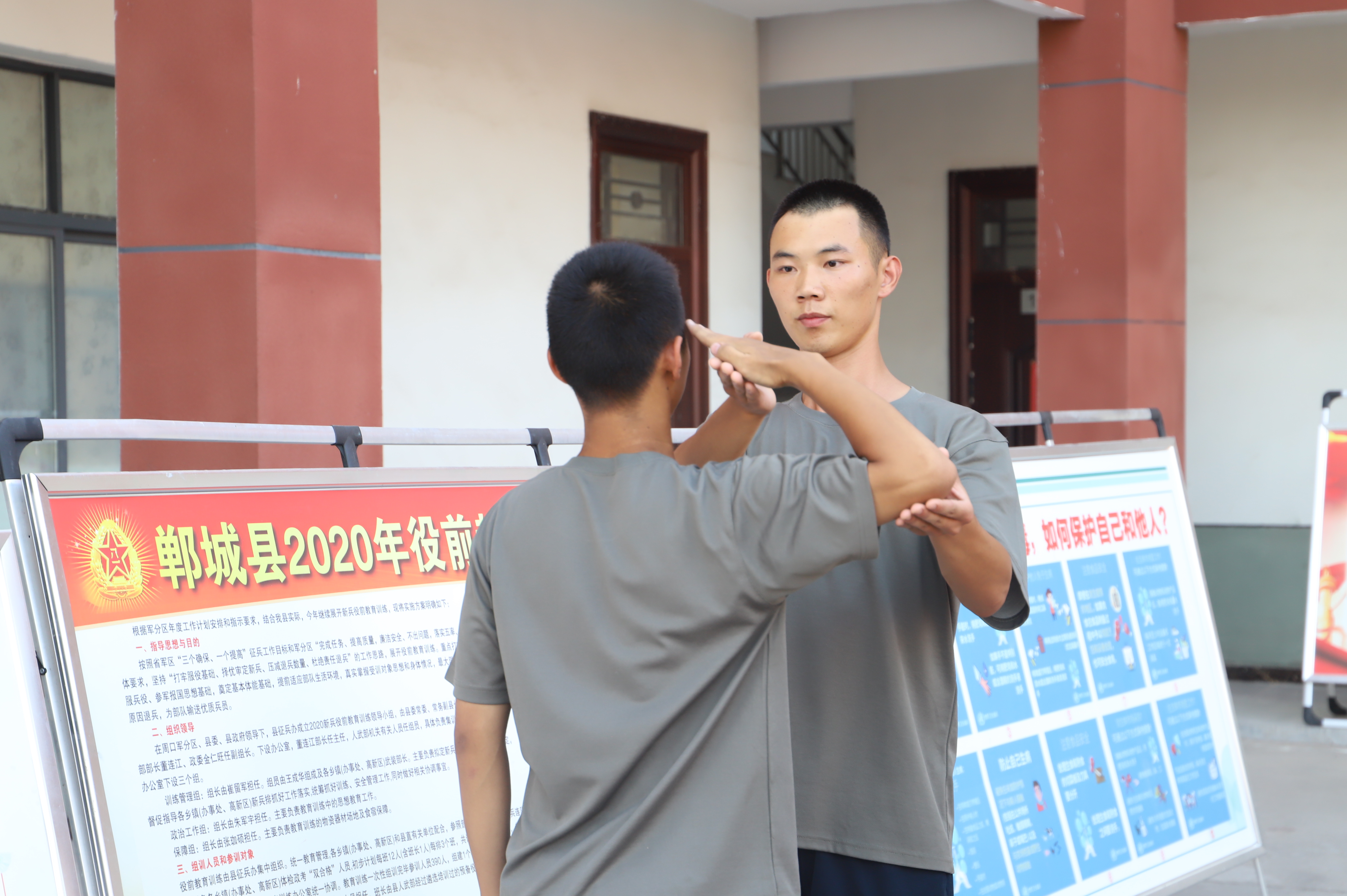 蛙跳、鴨子步、俯臥撐、側身敬禮、蹲起……盡管汗流浹背,兩位“老兵”在新兵面前沒有一絲疲倦,充分展現(xiàn)了軍人的風采,也流露出了兩位青年向往軍營的堅定意志。