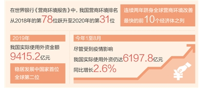 “十三五”期間,我國持續(xù)深化體制機制改革,全方位擴大對外開放,降低準入門檻,提升服務(wù)質(zhì)量。在世界銀行《營商環(huán)境報告》中,我國營商環(huán)境排名從2018年的第78位躍升至2020年的第31位,連續(xù)兩年躋身全球營商環(huán)境改善最快的前10個經(jīng)濟體之列。