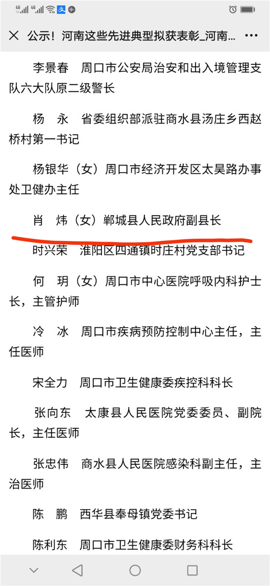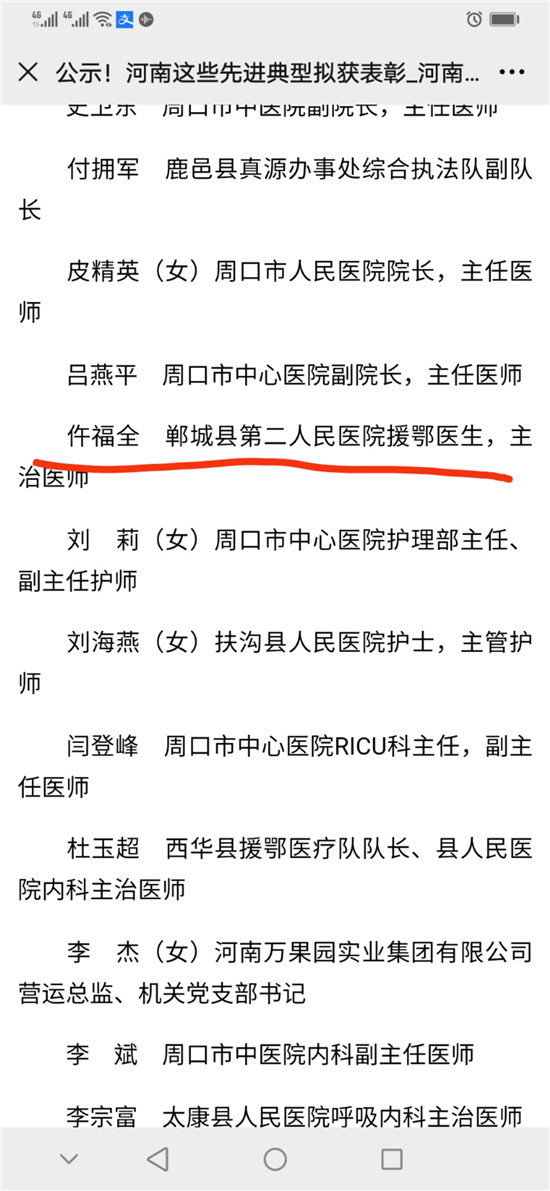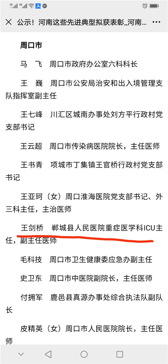 10月10日,河南省委、省政府表彰了一批抗擊新冠肺炎疫情先進個人、河南省抗擊新冠肺炎疫情先進集體、河南省優(yōu)秀共產(chǎn)黨員、河南省先進基層黨組織。其中,鄲城縣副縣長肖煒,縣第二人民醫(yī)院援鄂醫(yī)生、主治醫(yī)師仵福全,縣人民醫(yī)院重癥醫(yī)學(xué)科ICU主任、副主任醫(yī)師王劍橋3位同志,被評為河南省抗擊新冠肺炎疫情先進個人。