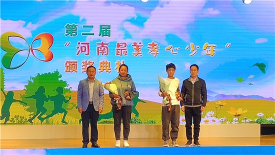 10月20日,河南省第二屆“河南最美孝心少年”頒獎(jiǎng)典禮在河南省實(shí)驗(yàn)學(xué)校鄭東小學(xué)舉行,全省表彰10名“河南最美孝心少年”,分別頒發(fā)獎(jiǎng)杯、證書和1萬元獎(jiǎng)勵(lì)。省教育廳副廳長毛杰等領(lǐng)導(dǎo)為孝心少年頒獎(jiǎng)并合影留念。鄲城縣汲水二中學(xué)生薛勝楠光榮受獎(jiǎng)。