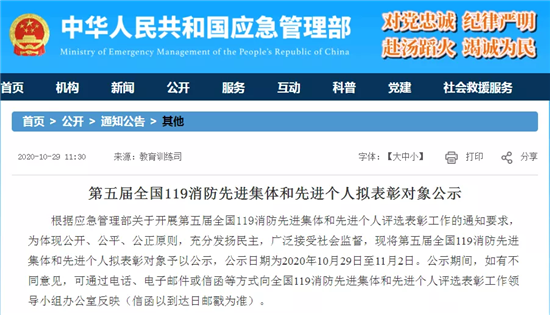 此次評選表彰工作堅持公開、公平、公正的原則,按照自下而上、逐級推薦、民主擇優(yōu)的方式進行,11月2日公示結(jié)束。據(jù)悉,這是首次將新組建的國家綜合性消防救援隊伍及其指戰(zhàn)員納入該獎項評選表彰范圍。