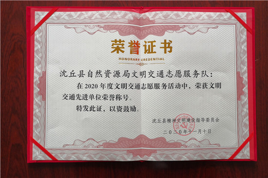 為大力弘揚(yáng)“奉獻(xiàn)、友愛、互動、進(jìn)步”的志愿服務(wù)精神,樹立典型、激勵先進(jìn),近日,沈丘縣精神文明建設(shè)指導(dǎo)委員會對2020年度文明交通志愿服務(wù)活動情況進(jìn)行通報表彰,全縣25家部門單位文明交通志愿服務(wù)隊、101名文明交通優(yōu)秀志愿者受表彰,沈丘縣自然資源局名列其中。