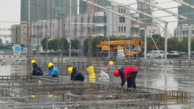 11月23日,記者在周口市體育中心看到,第一屆周商大會展位的搭建工作正在緊張進行,目前周商產(chǎn)品展示展覽區(qū)的主體鋼架結(jié)構(gòu)已見雛形