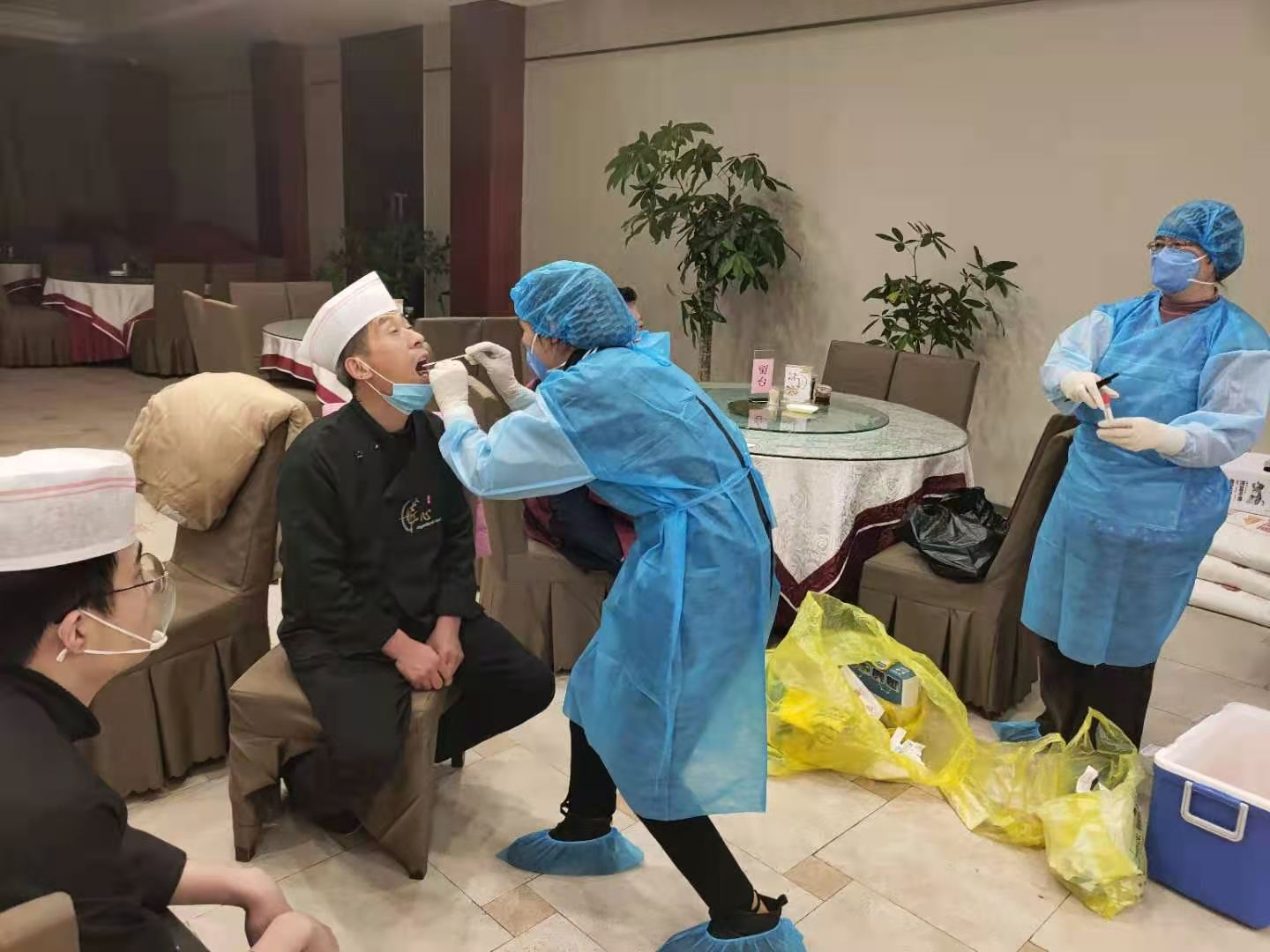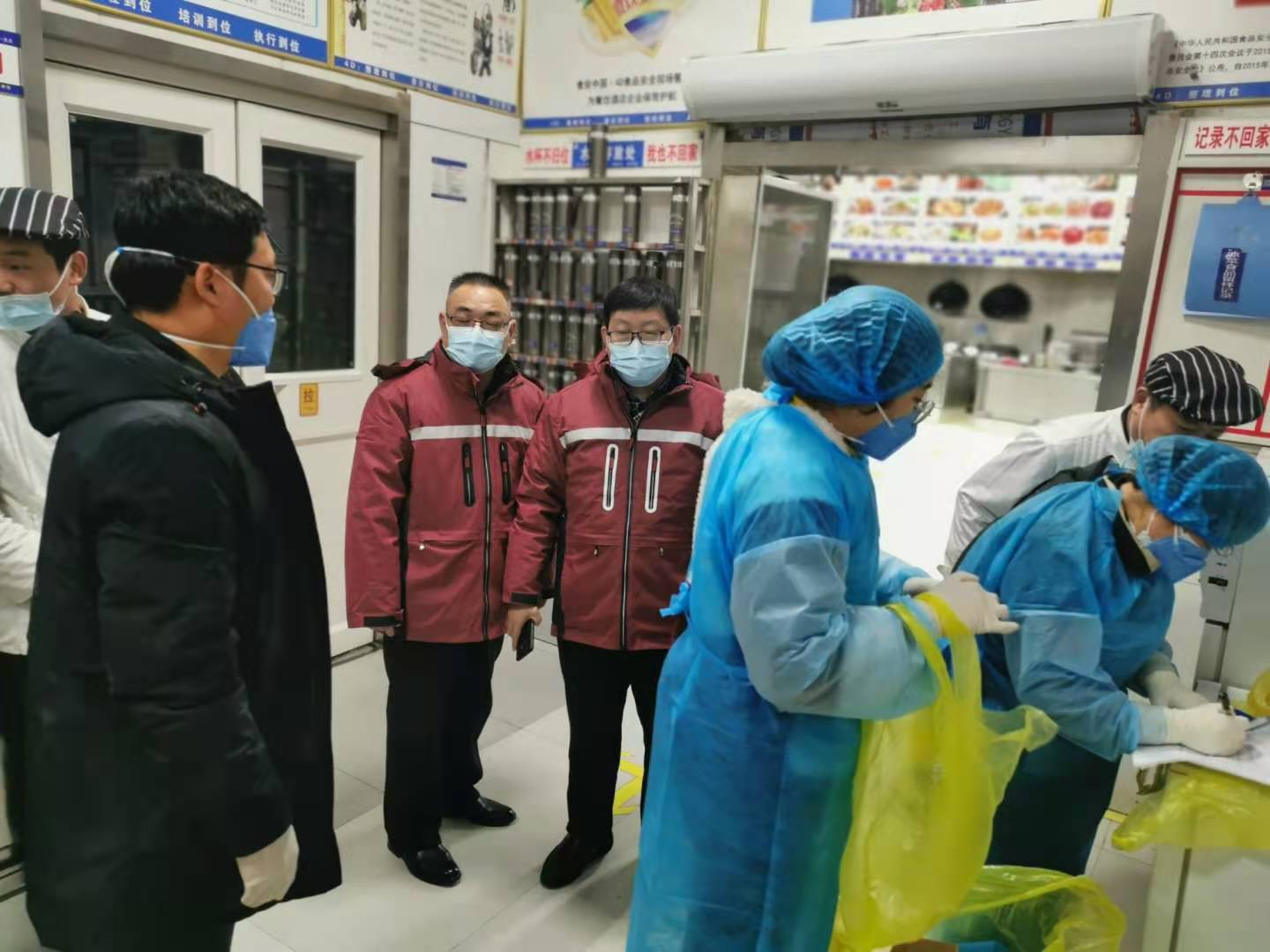 為助力第一屆周商大會(huì)圓滿成功,市衛(wèi)生健康委抽調(diào)近百名調(diào)精兵強(qiáng)將組成衛(wèi)生保障專班開展衛(wèi)勤保障工作。圖為工作人員在市委黨校迎賓館和體育賓館餐廳對后廚人員做核酸檢測及開展冷鏈?zhǔn)称废尽?/p>
