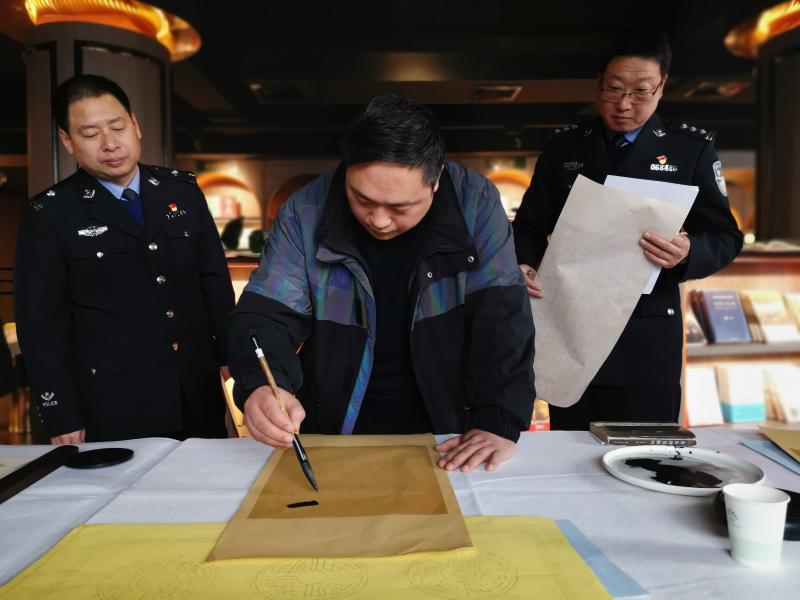 1月10日下午,沽讀書廊二樓翰墨飄香、筆鋒頓挫。為慶祝首個中國警察節(jié),書法家李為、何巖、陳濤、游富華、何祥峰、李雯云、軒敬賢以及祁庚鑫等一行,為川匯區(qū)公安分區(qū)民警義寫書法作品,送來一份特殊的節(jié)日禮物。