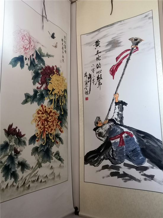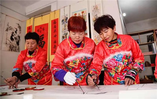 在建豪工作室的斜對面,是50歲村黨支部書記、村文聯(lián)主席盧全禮的書畫工作室。盧全禮書畫兼擅,還會武術、木刻、舞獅子,是附近有名的才子。記者看到,他為太康縣第二屆農民豐收節(jié)創(chuàng)作的中國畫《黃土地的心聲》,以該村嗩吶吹奏藝人幸福而夸張的演出情景,歌頌農村脫貧攻堅取得的巨大成果,極具鄉(xiāng)土氣息。在他的畫室,滿身文藝范兒的五西村民,正以新時代松鶴延年吉祥農民畫,齊心打造中原畫鶴第一村。經過培訓的農村大嫂大媽執(zhí)筆齊描畫,一時鶴鳴九皋,翩翩欲飛。