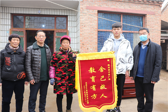 得知張廣坤所在學(xué)校的領(lǐng)導(dǎo)和老師要來村子,被救4歲男孩張子豪的奶奶帶著事先制作的錦旗來到張廣坤家說,原本打算把錦旗送到學(xué)校,感謝陳州高中培養(yǎng)出廣坤這樣的好學(xué)生,是廣坤救了他們?nèi)?。她說,事發(fā)當(dāng)天下午5時(shí),她在家做晚飯,一不留神,4歲的孫子獨(dú)自抱住球出門跑到村坑塘邊的空地上玩耍去了。玩耍中,孩子不慎將球踢進(jìn)了水塘?!?歲的孩子能懂啥,光想著撈他的皮球,水至脖頸,害怕了哭喊起來。當(dāng)日,附近沒有人,孩子身上又穿著襖,要不是被廣坤及時(shí)發(fā)現(xiàn),俺家的日子以后真沒法過?!敝v到這,男孩的奶奶直掉眼淚。