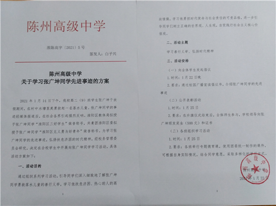 據(jù)陳州高中校長(zhǎng)白子興介紹,該校已經(jīng)向全校師生發(fā)起學(xué)習(xí)張廣坤先進(jìn)事跡的倡議,以助人為樂為榮,熱心主動(dòng)幫助他人。學(xué)校還將通過組織專題德育課、開展演講征文活動(dòng)等,深入持久開展學(xué)習(xí)榜樣活動(dòng)。