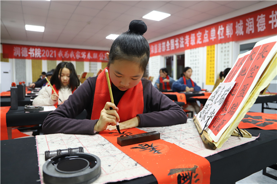 2月3日,記者在鄲城縣潤(rùn)德書(shū)院看到,“我為我家寫(xiě)春聯(lián)”活動(dòng)正緊張地進(jìn)行著,數(shù)十名書(shū)法小學(xué)員端坐案前、從容執(zhí)筆、揮毫作書(shū),一個(gè)個(gè)福字工整又靈活,一副副對(duì)聯(lián)娟秀又詩(shī)意。孩子們?cè)谖輧?nèi)全神貫注地寫(xiě)字,把最美好的祝福用自己的所學(xué)展示給家庭;家長(zhǎng)們?cè)诖巴獾嗄_張望,望子成龍、望女成鳳的心態(tài)表露無(wú)遺。