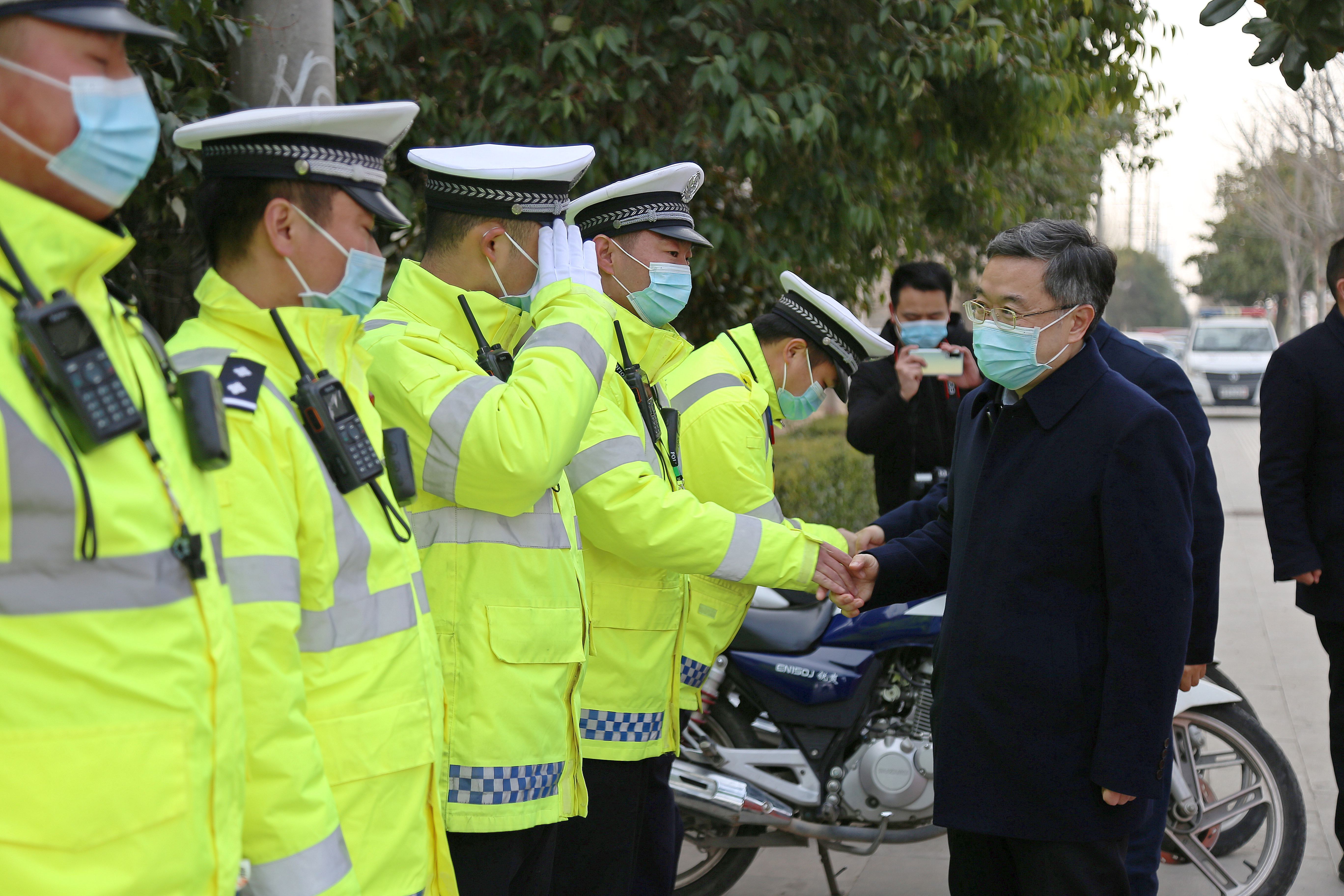 在縣交警大隊(duì)城區(qū)新區(qū)中隊(duì)五岔路口執(zhí)勤點(diǎn),皇甫立新、劉國(guó)慶同正在執(zhí)勤的交通民警一一握手,并代表縣四個(gè)班子向交警大隊(duì)全體民警、協(xié)警一年來付出的努力和辛苦表示感謝和問候,囑咐他們要注意安全,保重身體。在詳細(xì)聽取春節(jié)期間治堵保暢工作情況匯報(bào)后,皇甫立新對(duì)交警大隊(duì)全體民警和輔警在春節(jié)期間舍小家為大家,始終堅(jiān)守崗位保暢通的工作態(tài)度,以及無私奉獻(xiàn)、任勞任怨的工作作風(fēng)給予高度評(píng)價(jià)。并希望大家在春節(jié)期間,繼續(xù)發(fā)揚(yáng)吃苦耐勞的精神,科學(xué)做好道路安全保障工作,克服車多人多等困難,確保春節(jié)期間全縣道路交通安全暢通,讓全縣人民愉快度過一個(gè)平安、祥和的春節(jié)。同時(shí)要求縣交警大隊(duì)要進(jìn)一步做好執(zhí)勤民警后勤保障及防寒保暖工作,加強(qiáng)人員輪換上崗,切實(shí)保障公安交警切身利益,解決他們的后顧之憂。