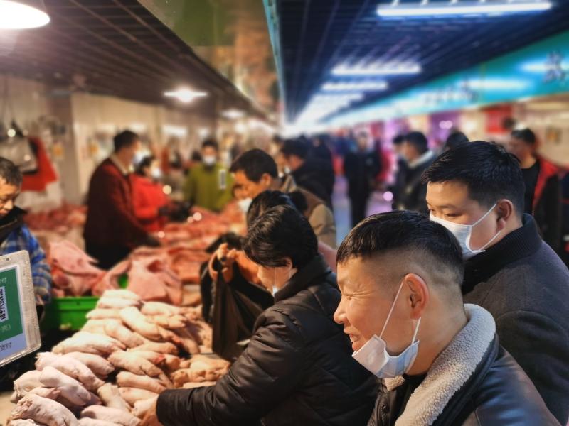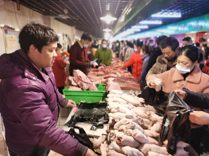 2月10日一大早,位于周口市的最大的黃淮農貿市場里熙熙攘攘,熱鬧豐常,行人小心翼翼地從來往的各式貨車間穿過,客商們被格外熱鬧的攤位吸引,駐足詢價、了解行情。圖為熱鬧的肉類銷售區(qū)域內市民在選購。