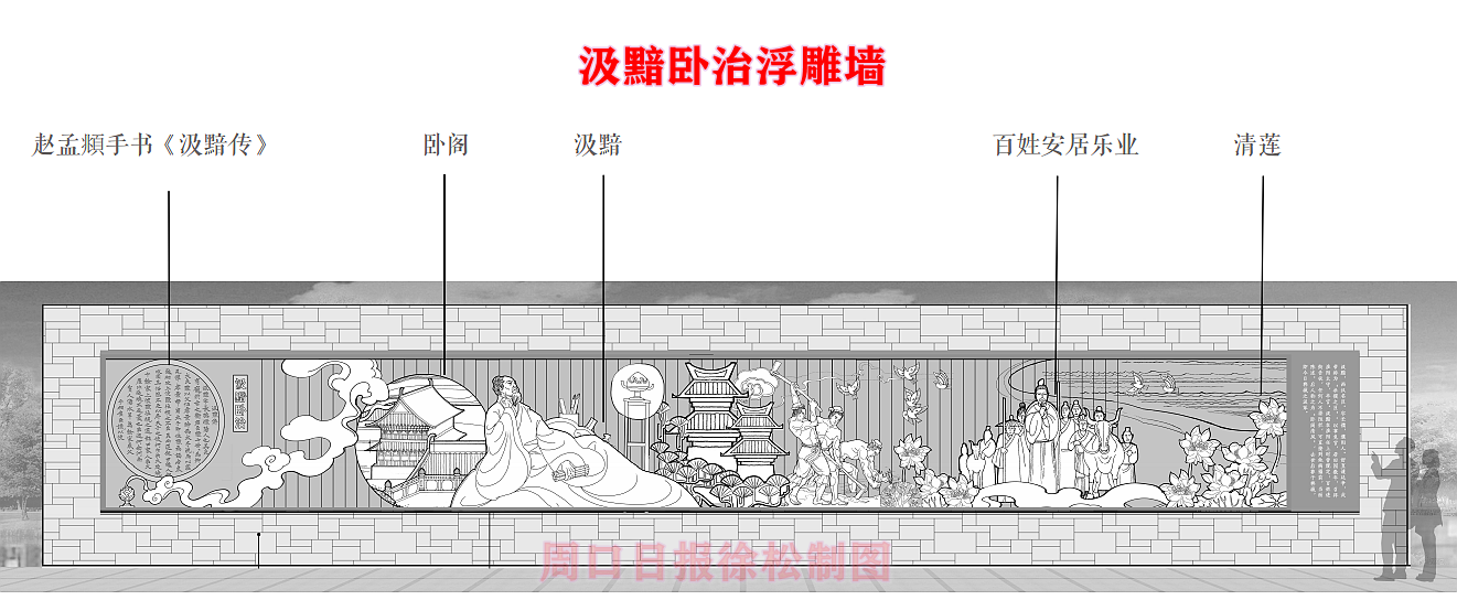 在縣委、縣政府綜合大樓東側的核心形象段,配合鄲城行政中心打造莊嚴、大氣氛圍的同時,對鄲城歷史文化進行了集中展示,包括鄲城的歷史沿革,鄲城的發(fā)展理念,歷史故事等。其中調水渠西側以現(xiàn)有人民廣場對應的綠地為基礎,設置了較多的歷史文化節(jié)點。如調水渠新華路橋頭北側的廉政文化廣場,講述了漢朝名臣汲黯的故事。汲黯為人耿直,直諫廷諍,親政愛民,敢于承擔責任,漢武帝劉徹稱其為“社稷之臣”。汲黯廉政廣場建設在此處更有著深遠的意義,它一方面提醒老百姓要了解歷史、敬畏先賢,同時也激勵著鄲城縣的各級黨員干部要在習近平新時代中國特色社會主義思想引領下,“不忘初心、牢記使命、廉潔奉公、一心為民”。