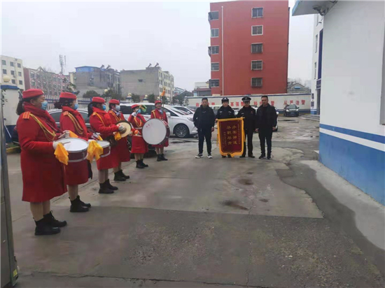 2月25日上午,項(xiàng)城市公安局水寨派出所門(mén)口鑼鼓齊鳴,異常熱鬧,兩名男子手持一面寫(xiě)有“辦案神速、盡職盡責(zé)”字樣的錦旗,送給派出所民警,深表謝意。