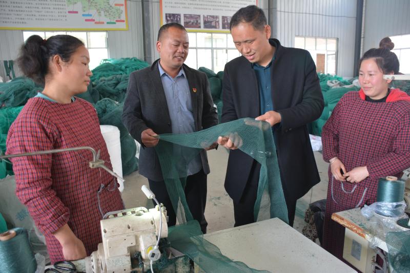 3月27日,商水縣平店鄉(xiāng)李崗村“商水縣龍巢網業(yè)公司”經理羅國昌向村黨支部書記李金棋(左二)介紹漁網編織產業(yè)產銷帶貧情況。羅國昌和妻子劉清華2009年創(chuàng)辦漁網編織加工廠、2017年擴建新區(qū),現(xiàn)有3個大型生產車間庫房,發(fā)展30多個分廠、40多個聯(lián)系點,年產各種成品漁網500萬條,產品銷往國內江蘇、安微、山東、河北、湖北等10多個省區(qū)和30多個沿??h市水產公司,部分出口到俄羅斯及東南亞地區(qū),年創(chuàng)產值約1.6億元,精準幫扶225戶群眾脫貧,帶貧群眾有1萬余人。