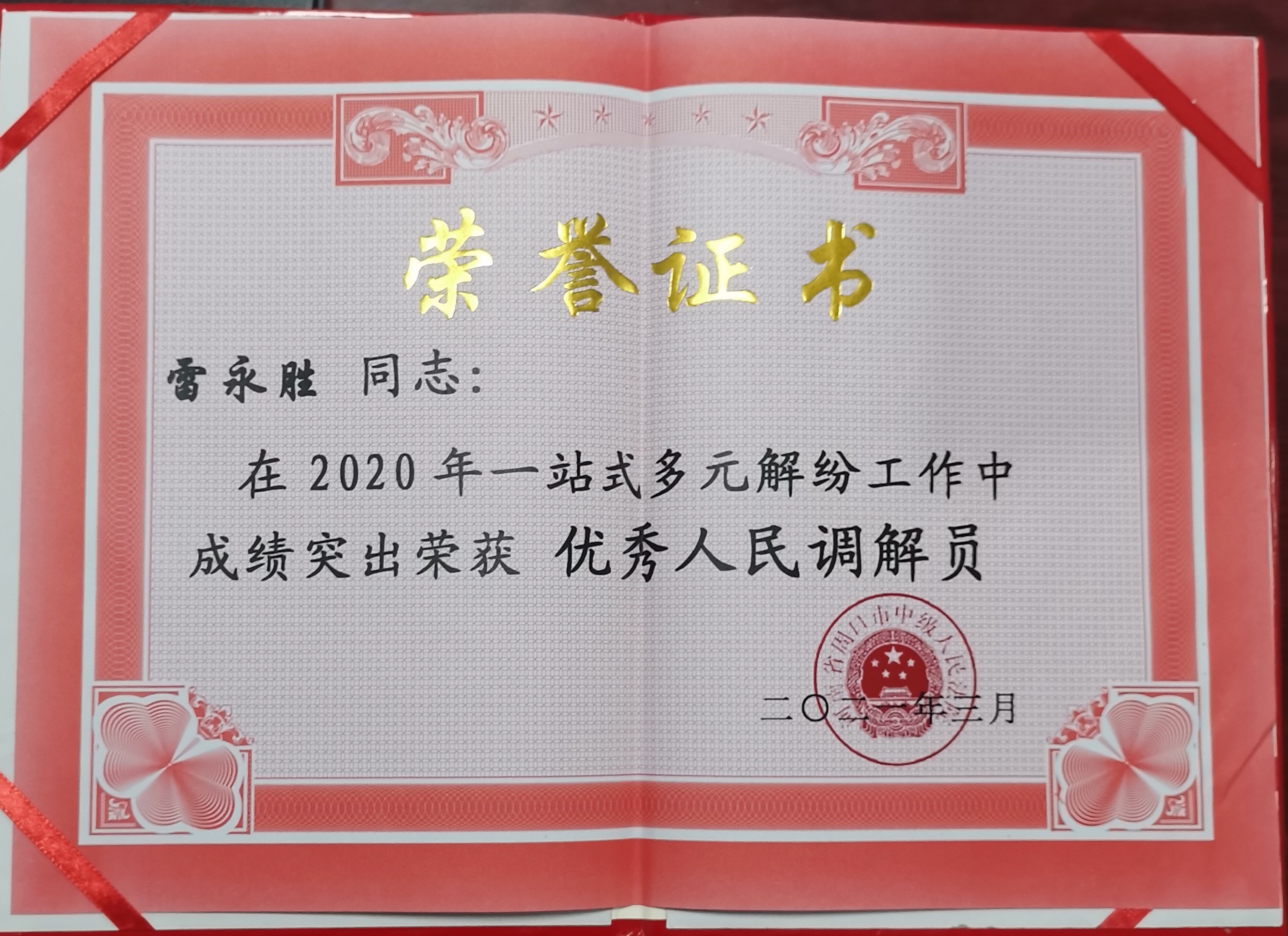 自2020年5月以來,雷永勝調(diào)解員已累計接受各類案件近200件,成功調(diào)解近百件,助力法院訴前調(diào)解工作邁入先進行列,化解了大量社會矛盾,為維護社會和諧穩(wěn)定作出了積極貢獻。日前,雷永勝被周口市中級法院評為“2020年度優(yōu)秀人民調(diào)解員”。