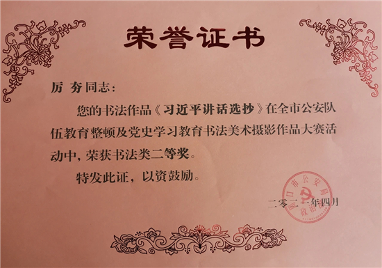 近日,扶溝縣公安局在全市公安隊(duì)伍教育整頓及黨史學(xué)習(xí)教育書(shū)法美術(shù)攝影作品大賽中榮獲優(yōu)秀組織獎(jiǎng),同時(shí),該局推薦報(bào)送的多部書(shū)法攝影作品大賽中也榮獲多個(gè)獎(jiǎng)項(xiàng)。其中,書(shū)法類(lèi)榮獲一等獎(jiǎng)1名、二等獎(jiǎng)2名、三等獎(jiǎng)1名、優(yōu)秀獎(jiǎng)1名;美術(shù)類(lèi)榮獲二等獎(jiǎng)2名、三等獎(jiǎng)4名;攝影類(lèi)榮獲二等獎(jiǎng)1名、三等獎(jiǎng)1名。