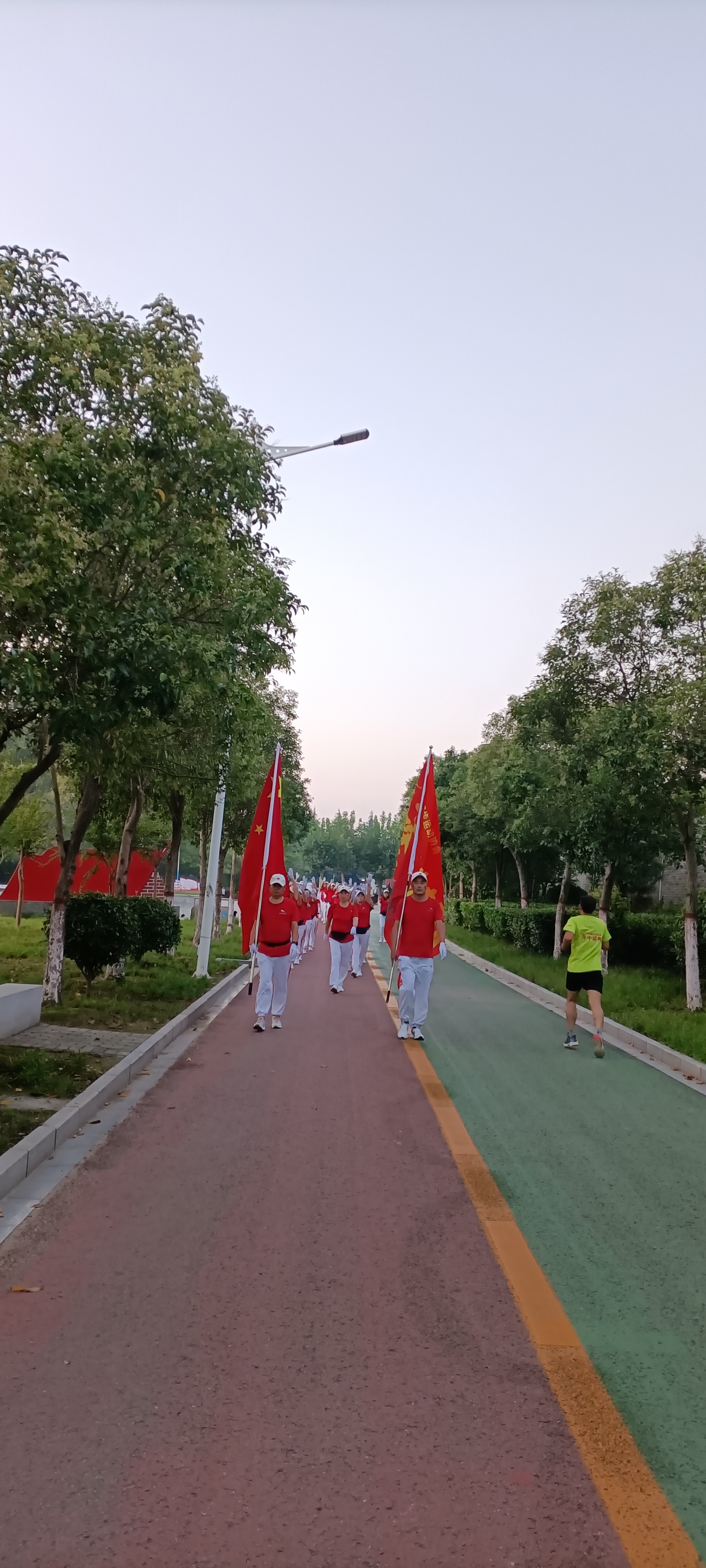 10月1日清晨,周口健步走大鐵牛晨隊的100余名隊員手持國旗,邁著矯健的步伐,迎著初升的朝陽,行走在周口公園,以健康的身姿慶祝祖國生日。周口日報·周道客戶端記者 高洪馳攝