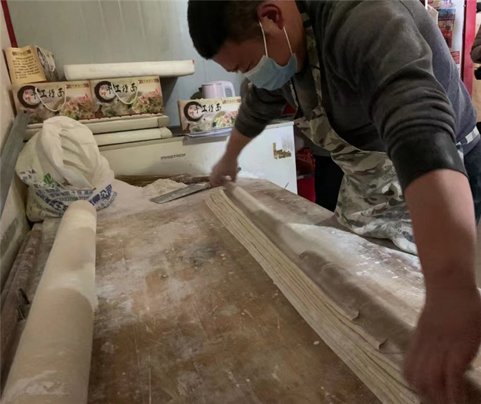 此時(shí),固墻鎮(zhèn)集市最低溫度為零攝氏度,40歲的王永強(qiáng)卻汗流浹背。他,正在自家面館里忙得熱火朝天。從14歲起,王永強(qiáng)就跟著表哥學(xué)習(xí)做手搟面,到現(xiàn)在已有26年的制作經(jīng)驗(yàn)?!斑^(guò)年這段時(shí)間一天搟10小時(shí)以上,能出個(gè)七八百碗,就這都賣不及?!蓖跤缽?qiáng)邊說(shuō)邊做準(zhǔn)備工作,只見(jiàn)他將一盆醒好的、重40斤,用高筋面粉和鹽和好的面團(tuán)鋪在案板上,拿出一根一米五長(zhǎng)的鐵棍將面團(tuán)按壓平整,再用有十幾年歷史的搟面杖,邊鋪撒玉米淀粉、邊用力搟。1個(gè)小時(shí)后,面團(tuán)被搟至薄皮狀,最后按層折疊鋪好,用快刀切成相等寬度,撣走多余面粉,挽成麻花狀。如此,遇水不散、出水不沾、溫潤(rùn)光滑、筋而不膩的固墻手搟面就完成了。固墻手搟面最常見(jiàn)的做法是用大火多水煮沸后,撈起配以番茄雞蛋、蒜泥黃瓜,拌勻后享用。夾起一筷子面條,觀其形如玉帶臨風(fēng),察其色若飛雪粼粼,送入口中品其味,則似玉蘭入口,真是美哉!爽哉!
