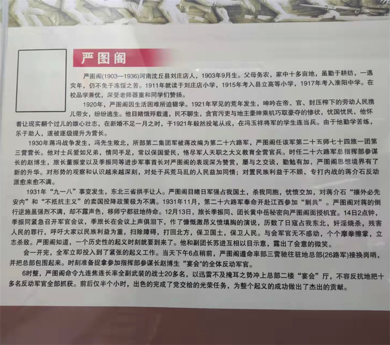 嚴(yán)圖閣出生于1903年,河南省沈丘縣人。1911年,嚴(yán)圖閣被父親送進(jìn)劉莊店小學(xué)讀書,1915年考入縣立高等小學(xué),1917年投考淮陽中學(xué)被錄取。他刻苦讀書,成績優(yōu)異,深得老師和同學(xué)們的贊揚(yáng)。1921年,他毅然背井離鄉(xiāng),外出從軍。1930年,嚴(yán)圖閣任國民革命軍第二十六路軍一團(tuán)三營營長。1931年12月,參加著名的寧都起義,成為中國共產(chǎn)黨領(lǐng)導(dǎo)的革命隊(duì)伍中的一員。寧都起義后,嚴(yán)圖閣所在部隊(duì)改編為紅軍第五軍團(tuán),由于其驍勇善戰(zhàn),累積戰(zhàn)功,被任命為第十六師參謀長。1932年,嚴(yán)圖閣正式加入中國共產(chǎn)黨。1935年在湖北一場戰(zhàn)斗中身負(fù)重傷,后轉(zhuǎn)移至湖南省平江縣治療。1936年3月,嚴(yán)圖閣奉命擔(dān)任湘鄂贛省軍區(qū)司令員職務(wù),進(jìn)行游擊戰(zhàn)爭,為保衛(wèi)湘鄂贛革命根據(jù)地作出了貢獻(xiàn)。1936年11月,嚴(yán)圖閣因病不幸去世。