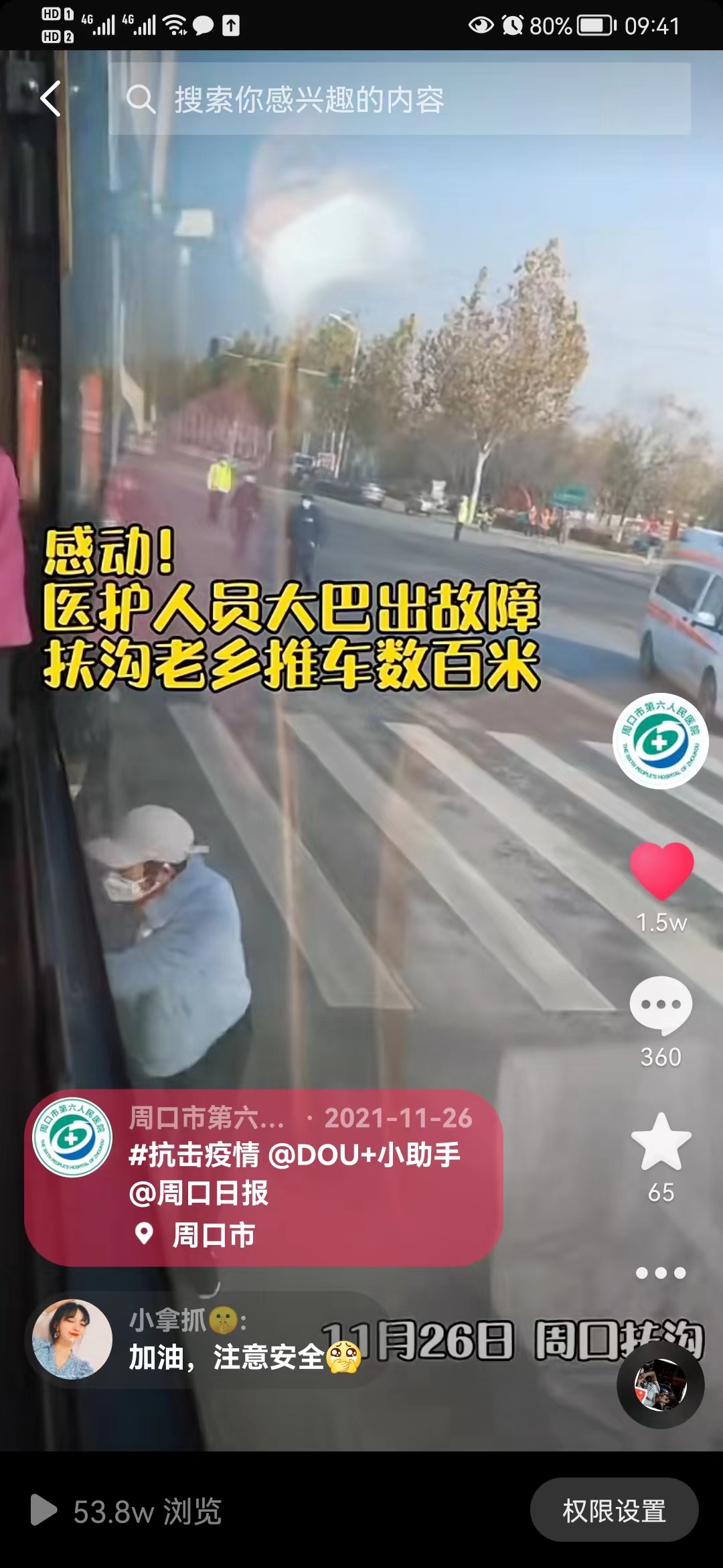 回去的時候,楊妮她們坐的大巴車出了故障,沒辦法正常啟動,扶溝鄉(xiāng)親們,親自推車數(shù)百米,幫助她們的大巴啟動。她坐在車上非常感動,用手機(jī)記下了這一幕,在后來醫(yī)院的宣傳中,這條段視頻被點(diǎn)擊了50多萬次,收獲了1萬多人的點(diǎn)贊。