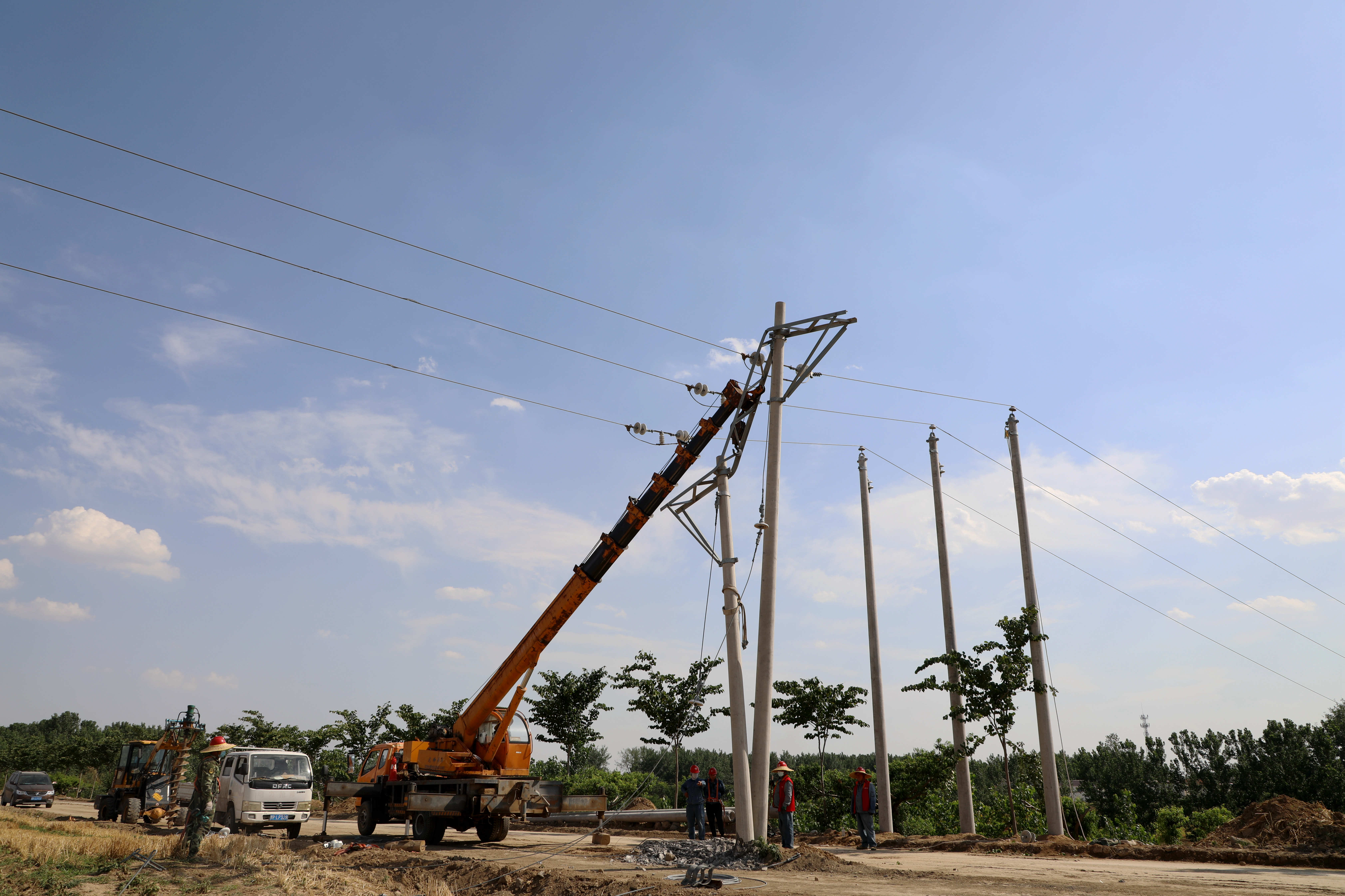 6月13日11時,天氣格外晴朗,烈日下氣溫突破38攝氏度。西華縣黃橋鄉(xiāng)潁河河堤上一片忙碌的景象,該縣供電公司搶修人員正在烈日下緊張有序地忙活著。