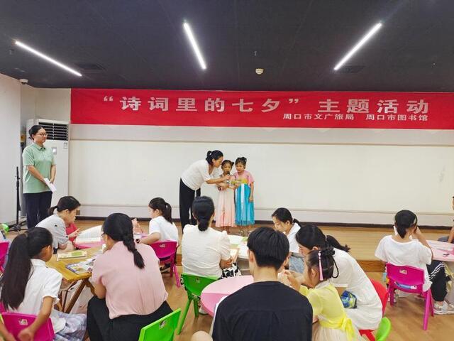 七夕今宵看碧霄,牽??椗珊訕?。8月20日,一場別開生面的“詩詞里的七夕”主題活動在周口市圖書館青少年活動中心舉行。書香覓詩詞、同心題詩詞、粘土畫詩詞……參與的孩子在詩情畫意中感受到中華傳統(tǒng)節(jié)日的內(nèi)涵。