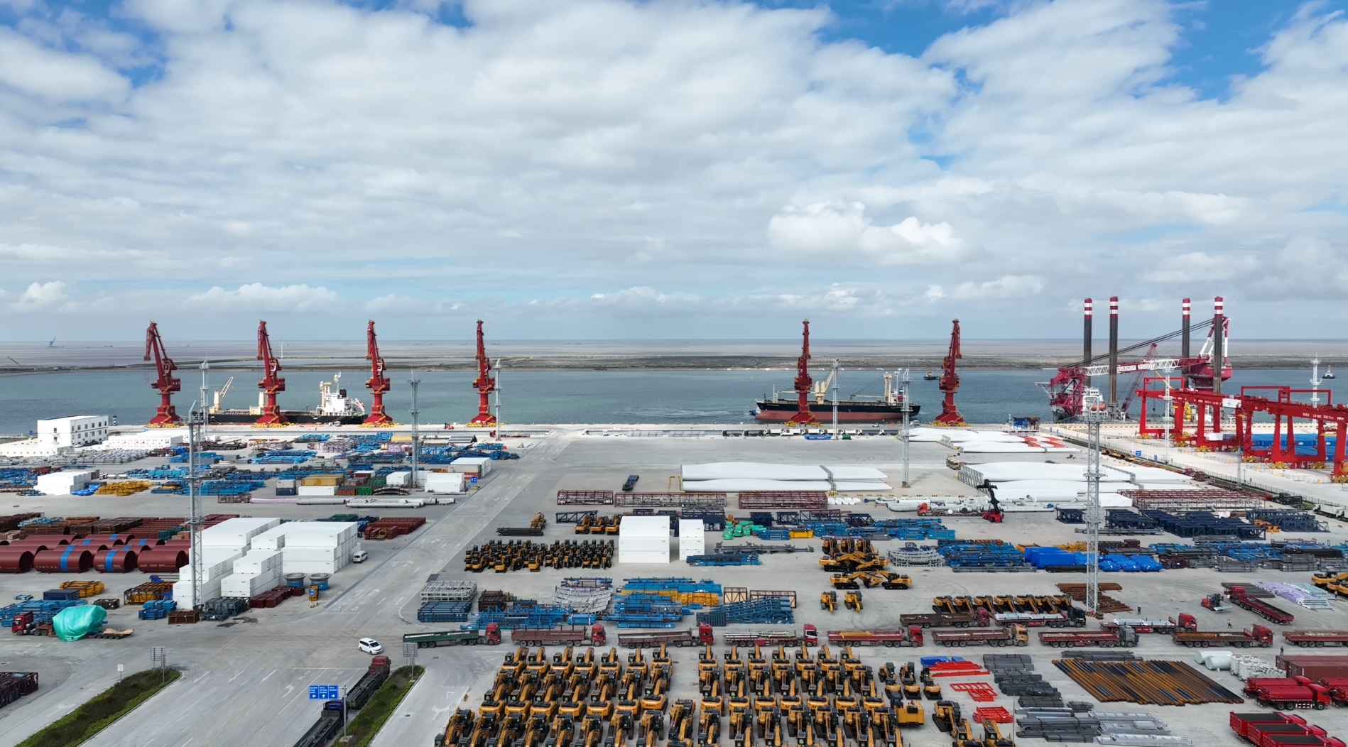 站在呂四起步港港區(qū)綜合樓的最高處,極目遠(yuǎn)眺,港口景觀盡收眼底。港池父親般寬闊的臂膀,將一艘艘越洋而來的萬(wàn)噸巨輪攬入懷中;挖掘機(jī)和風(fēng)機(jī)葉片被“碼”得整整齊齊,正待裝船出口;機(jī)器不停運(yùn)轉(zhuǎn),給??康拇谎b卸貨物;重型貨柜車進(jìn)出有序、川流不息。而令人驚奇的是,偌大的港口幾乎沒有看到一個(gè)工作人員。