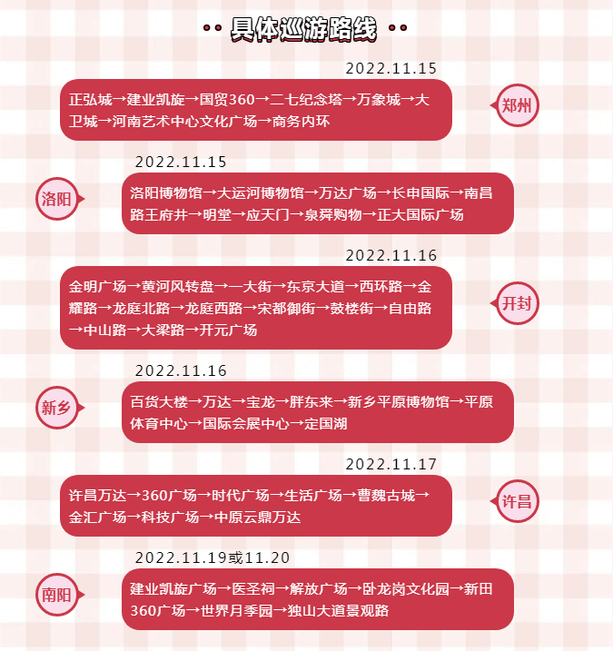 巡游活動(dòng)將會(huì)陸續(xù)在開(kāi)封、洛陽(yáng)、新鄉(xiāng)、許昌、南陽(yáng)五市展開(kāi),途經(jīng)各個(gè)地市商圈及市中心地帶,馬上參考我們下方的路線,追著我們的車隊(duì)一起跑起來(lái)吧!