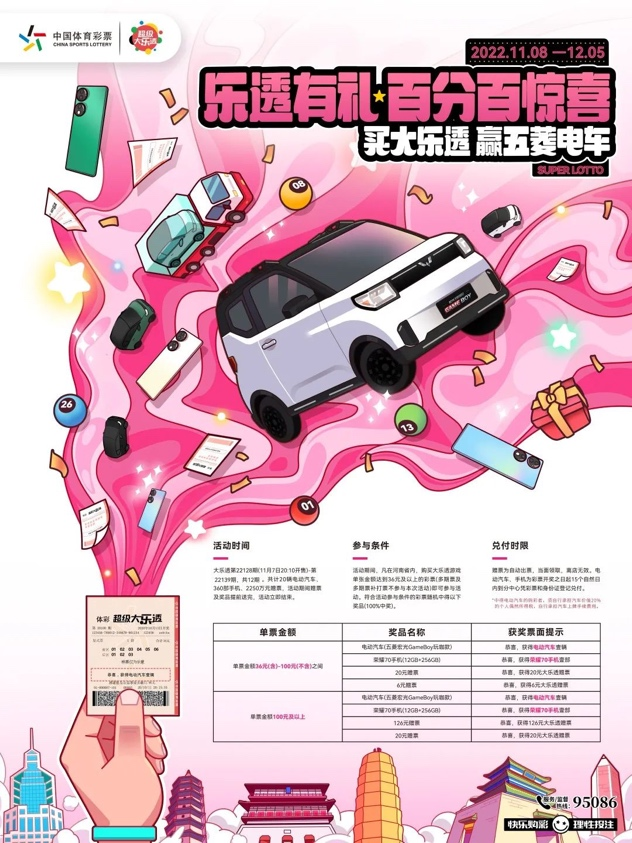 巡游期間,河南體彩大樂(lè)透的購(gòu)彩抽獎(jiǎng)活動(dòng)也將同步開(kāi)啟,大樂(lè)透第22128期(11月7日20:10開(kāi)售)-第22139期,共12期,期期均有大禮派送,頭獎(jiǎng)可獲得五菱mini GameBoy玩咖版一輛!
