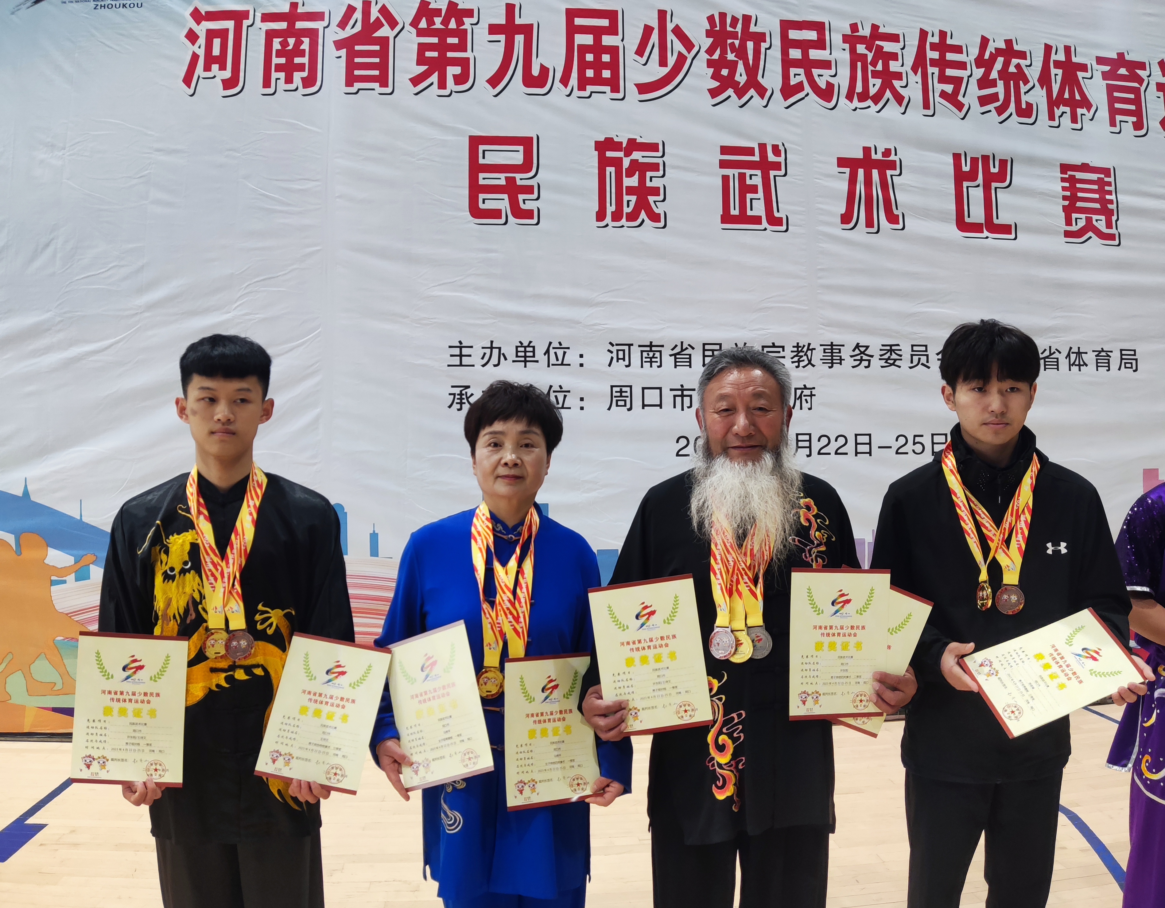 周口隊(duì)運(yùn)動(dòng)員王詩(shī)文、馬艷平、許東陽(yáng)、蘇俊瑞領(lǐng)取獎(jiǎng)牌和證書(從左至右)。