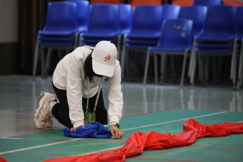 志愿者在用心清理押加比賽場(chǎng)地中的細(xì)小雜物。記者 劉俊濤 攝