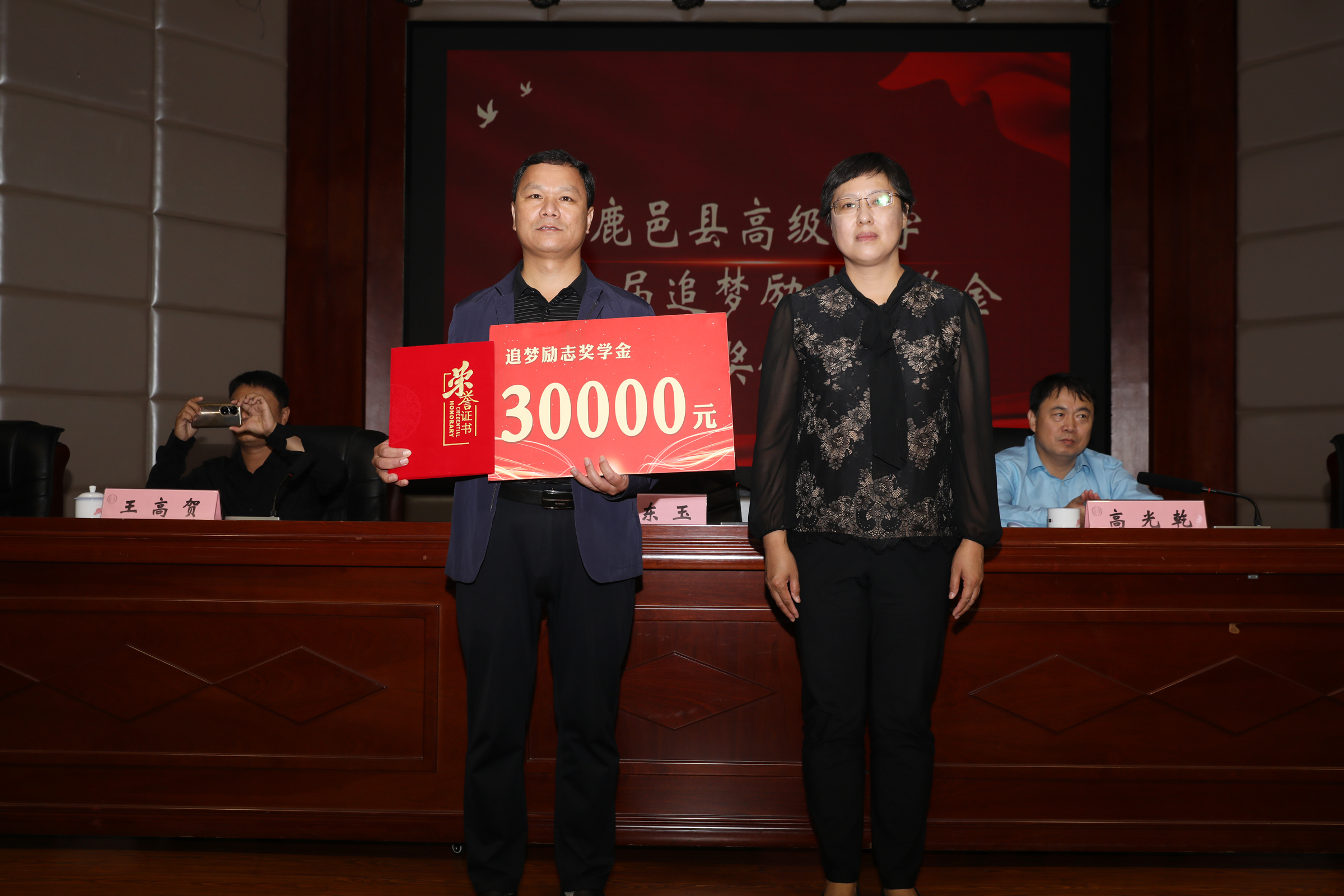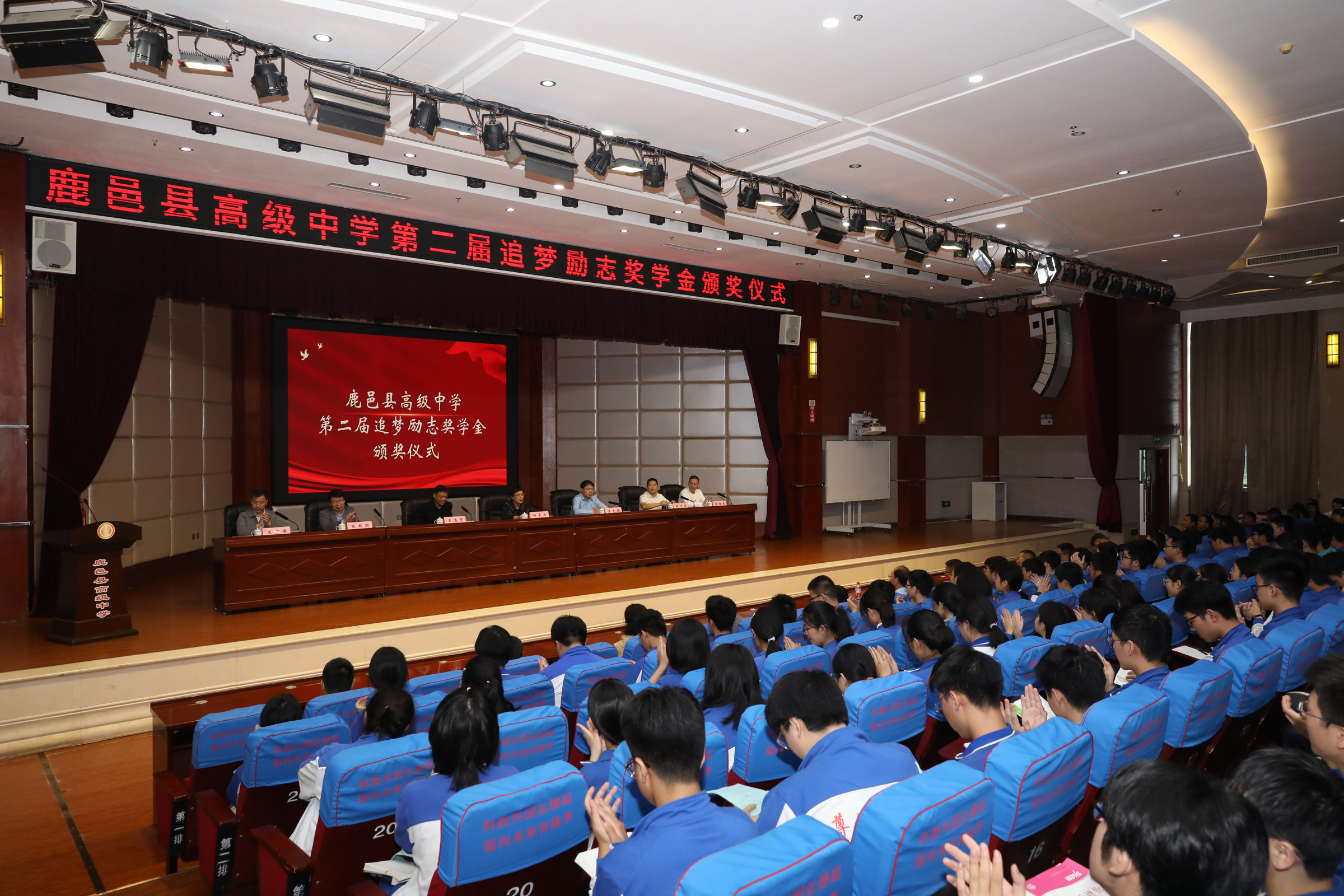 9月28日,鹿邑縣高級(jí)中學(xué)第二屆追夢(mèng)勵(lì)志獎(jiǎng)學(xué)金頒獎(jiǎng)儀式在學(xué)術(shù)報(bào)告廳舉行??h教體局黨組書(shū)記、局長(zhǎng)何東玉,學(xué)校黨總支書(shū)記高光乾,優(yōu)秀校友王高賀、張殿朋、耿文清、李偉杰及部分師生代表參加頒獎(jiǎng)儀式。副校長(zhǎng)王巖峰主持頒獎(jiǎng)儀式。