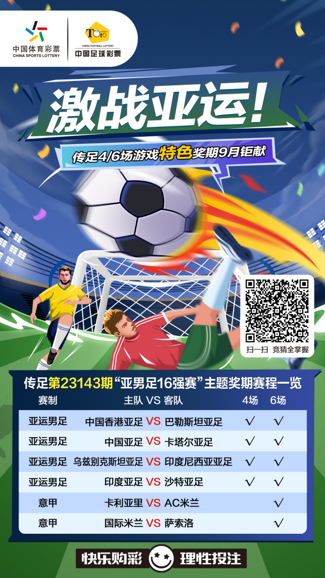 杭州亞運(yùn)會(huì)男足16強(qiáng)出爐,傳足4/6場(chǎng)游戲第23143期競(jìng)猜對(duì)象為4場(chǎng)亞運(yùn)男足1/8決賽賽事和2場(chǎng)意甲賽事,分別為中國(guó)香港亞足VS巴勒斯坦亞足、中國(guó)亞足VS卡塔爾亞足、烏茲別克斯坦亞足VS印度尼西亞亞足、印度亞足VS沙特亞足、卡利亞里VSAC米蘭和國(guó)際米蘭VS薩索洛。