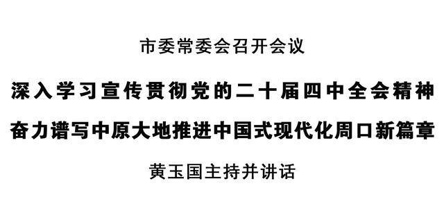 會議強調(diào),要把學習宣傳貫徹黨的二十屆四中全會精神,作為各級黨委(黨組)理論學習中心組集體學習的重要內(nèi)容,納入黨校(行政學院)教育培訓的必修課程,做到黨員干部全覆蓋;各級宣傳部門要充分利用各種形式和手段,做好權(quán)威解讀和分眾化傳播,讓廣大黨員干部群眾聽得懂、記得住、落實在行動上;要把貫徹落實全會精神與習近平總書記在河南考察時重要講話精神緊密結(jié)合起來,聚焦“兩高四著力”,錨定“1+2+4+N”目標任務(wù)體系,落實市委“16232”總體工作思路,突出抓好重點項目建設(shè)和招商引資、農(nóng)業(yè)農(nóng)村、城市規(guī)劃建設(shè)管理、文旅發(fā)展、民生實事、社會治理等重點工作,全力以赴打贏“十四五”收官戰(zhàn),高質(zhì)量編制“十五五”規(guī)劃,切實把全會部署轉(zhuǎn)化為推動現(xiàn)代化周口建設(shè)的實際行動。