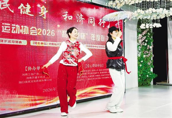 健步走愛好者展示自編自演的健身操。近日,周口市健步走協(xié)會年會在周口中心城區(qū)世紀星酒店舉行,50多支健步隊、數(shù)百名愛好者齊聚一堂,共迎新春、共話健康。記者 徐啟峰 攝影