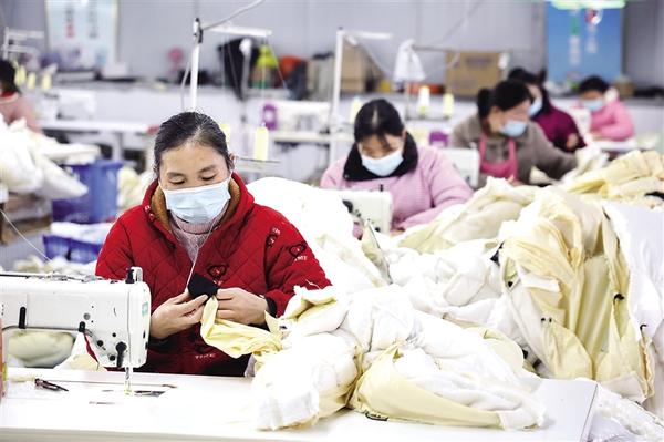 近年來,淮陽區(qū)四通鎮(zhèn)中營子村以黨建為核心引擎,筑牢基層戰(zhàn)斗堡壘,牽頭建起現(xiàn)代農(nóng)業(yè)服務(wù)合作社、種植合作社等,走出“黨組織搭臺、企業(yè)唱戲、群眾受益”的強(qiáng)村路徑。圖為村民在村辦服裝廠工作。