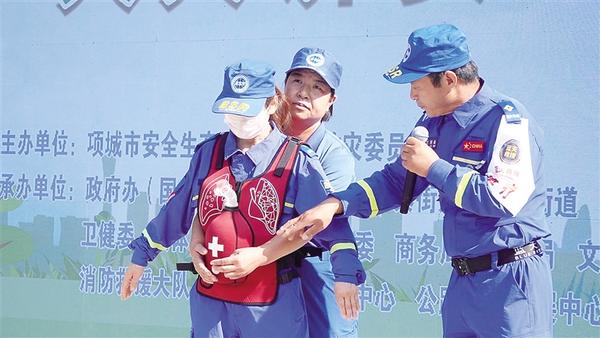 6月16日,項城市舉行“安全宣傳咨詢?nèi)铡被顒印;顒釉O(shè)置警示教育片展播、應(yīng)急技能演示、救援裝備展示、安全咨詢等環(huán)節(jié)。圖為項城應(yīng)急藍天救援隊3名隊員演示海姆立克急救法操作流程。
