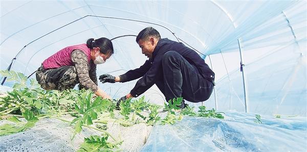 3月15日,在扶溝縣江村鎮(zhèn)江北村現(xiàn)代農(nóng)業(yè)產(chǎn)業(yè)園的大棚里,農(nóng)戶在管理西瓜苗。該園區(qū)占地500余畝,主要種植麒麟美都西瓜、太陽花水果玉米、優(yōu)質(zhì)菠菜,預(yù)計(jì)每畝年綜合收益1.2萬元,輻射帶動(dòng)周邊200余名群眾在家門口就業(yè)。