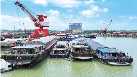 清晨的沙潁河畔,周口港范營作業(yè)區(qū)一派繁忙景象。巍然聳立的橋吊如鋼鐵巨臂,精準地將五顏六色的集裝箱吊裝至貨輪;