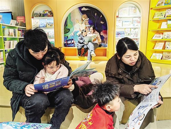 昨日, 市民帶著孩子在市新華書店內(nèi)讀書。孩子們或聚精會神地看書,或認真聽家長講故事,在書香的陪伴下度過了有意義的一天。