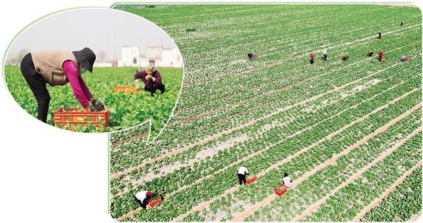 近年來,我市積極推廣“合作社+農(nóng)戶”“家庭農(nóng)場+農(nóng)戶”經(jīng)營模式,鼓勵農(nóng)民通過土地流轉(zhuǎn)將分散耕地整合起來,實現(xiàn)集中化、規(guī)?;?jīng)營,全力提高土地利用效率,為鄉(xiāng)村振興注入強勁動力。圖為4月11日,在淮陽區(qū)王店街道范莊行政村的農(nóng)田里,村民正采收蔬菜。