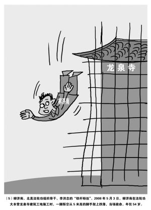 ?、?nbsp;柳濟南,北美法輪功組織骨干,李洪志的鐵桿粉絲。2008年5月3日,柳濟南在法輪功大本營龍泉寺建筑工地施工時,一腳踏空從5米高的腳手架上跌落,當(dāng)場斃命,年僅54歲。(漫畫作者 星雨)