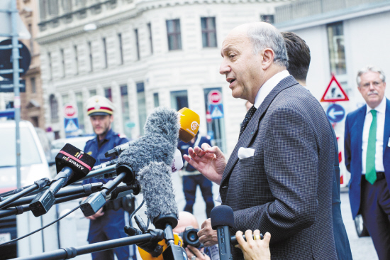 新一輪伊核問題談判在維也納舉行   6月27日,在奧地利首都維也納,法國(guó)外交部長(zhǎng)法比尤斯在舉行新一輪伊核問題談判的柯堡宮殿酒店外接受記者采訪。當(dāng)日,伊朗核問題六國(guó)、歐盟與伊朗在奧地利首都維也納柯堡宮殿酒店展開新一輪磋商。