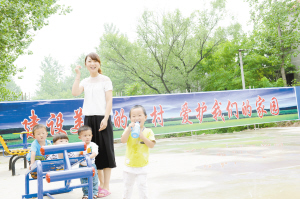 五里廟村村民周振蕾帶著小朋友們在健身廣場上玩耍,臉上充滿喜悅和幸福。