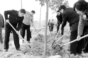 市委書記徐光等領導仔細培土。記者 王映 攝